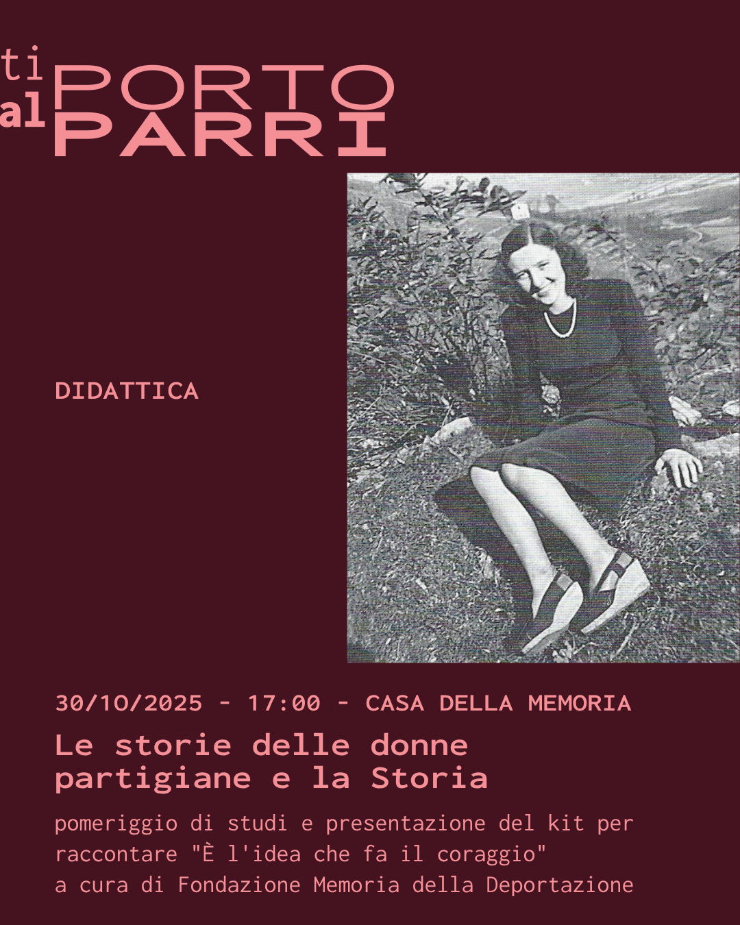 Casa della Memoria, via F. Confalonieri 14 Milano – ore 17.00 Le storie delle donne partigiane e la Storia Incontro per chi insegna Pomeriggio di studi realizzato nel quadro del progetto “Stanche di guerra”, a cura di Fondazione Memoria della Deportazione, grazie al contributo di Fondazione Cariplo e Milano è Memoria e il sostegno di Enciclopedia delle Donne e Udi Velia Sacchi Programma Saluti Sara Zanisi – Direttrice generale dell’Istituto Nazionale Ferruccio Parri Floriana Maris – Presidente della Fondazione Memoria della Deportazione Diana De Marchi – Consigliera – Presidente della Commissione Pari Opportunità Diritti Civili del Comune di Milano Interventi Roberta Cairoli – Vogliamo vivere!: le donne e la Resistenza Rosangela Pesenti – Donne e leggi in Italia: l’eredità delle partigiane Presentazione del kit per raccontare legato al graphic novel È l’idea che fa il coraggio a cura di Fondazione Memoria della Deportazione con la partecipazione del coordinamento degli istituti lombardi della Resistenza afferenti all’Istituto Nazionale Ferruccio... leggi tutto